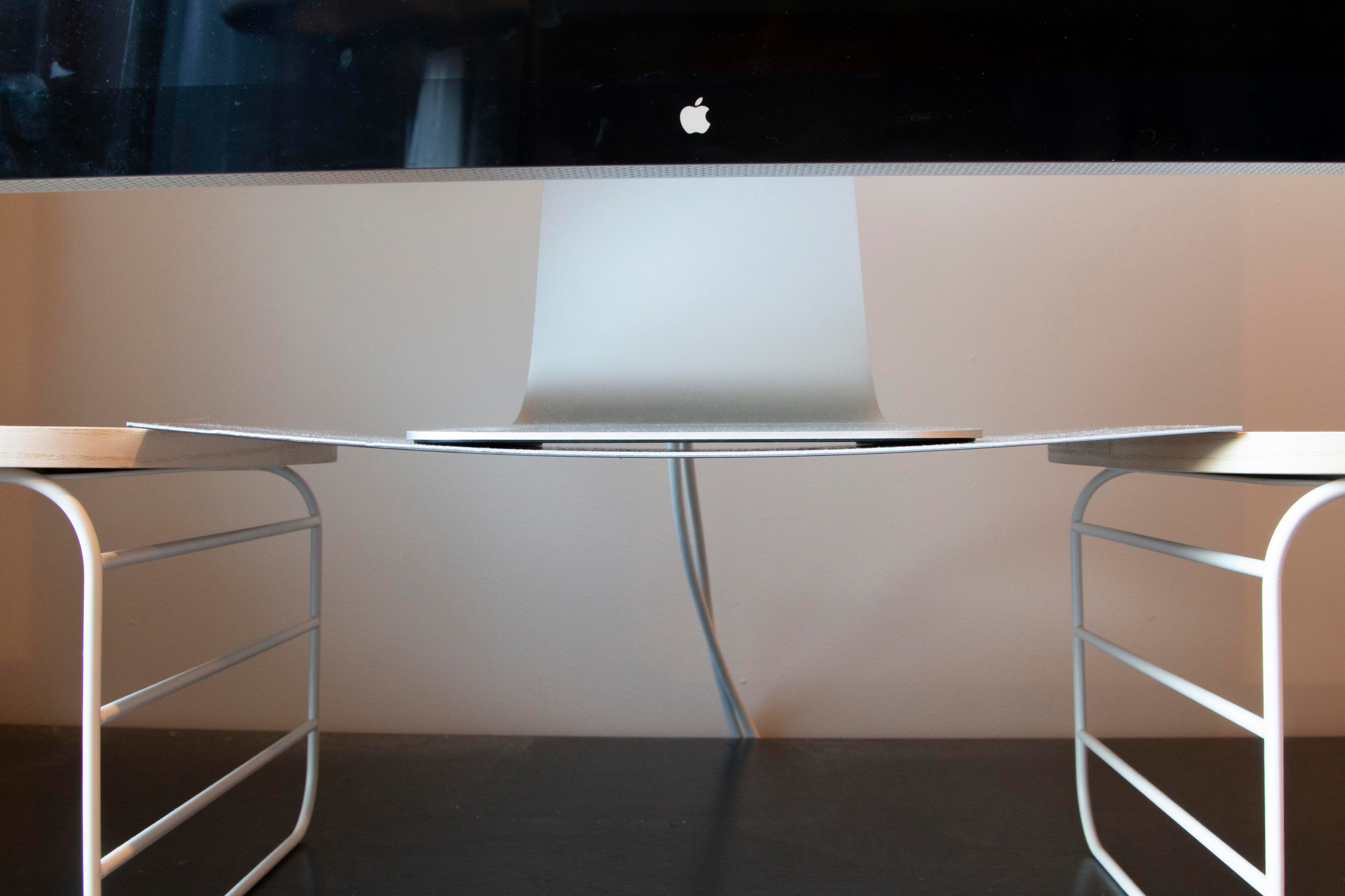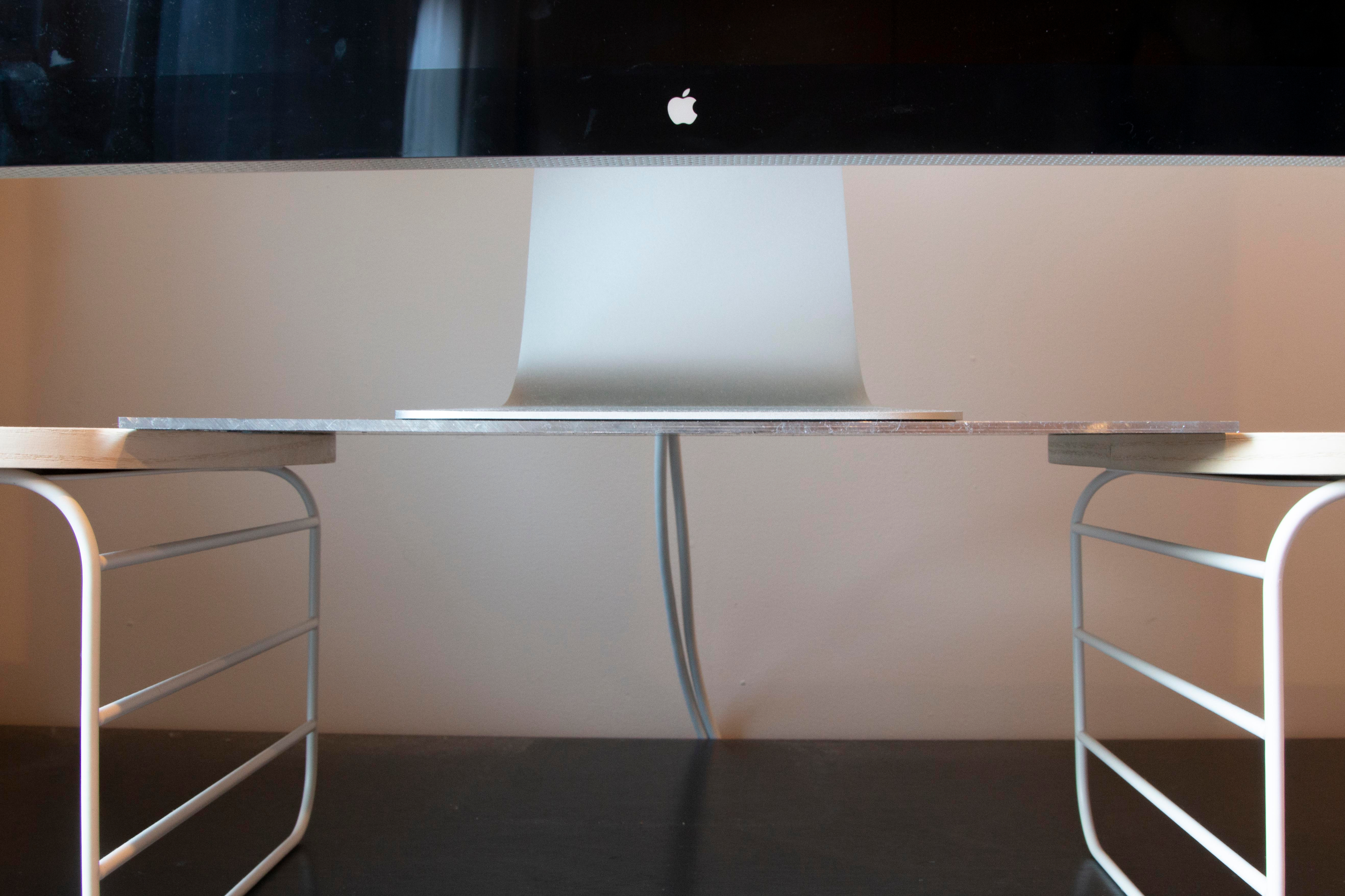 After benchmarking laptops and monitors average dimensions and then modeling in chip board, testing was conducted with intended materials. Both aluminum and steel sheets with the final dimensions were tested with a 25lb monitor resting on top of the sheets while suspended.
