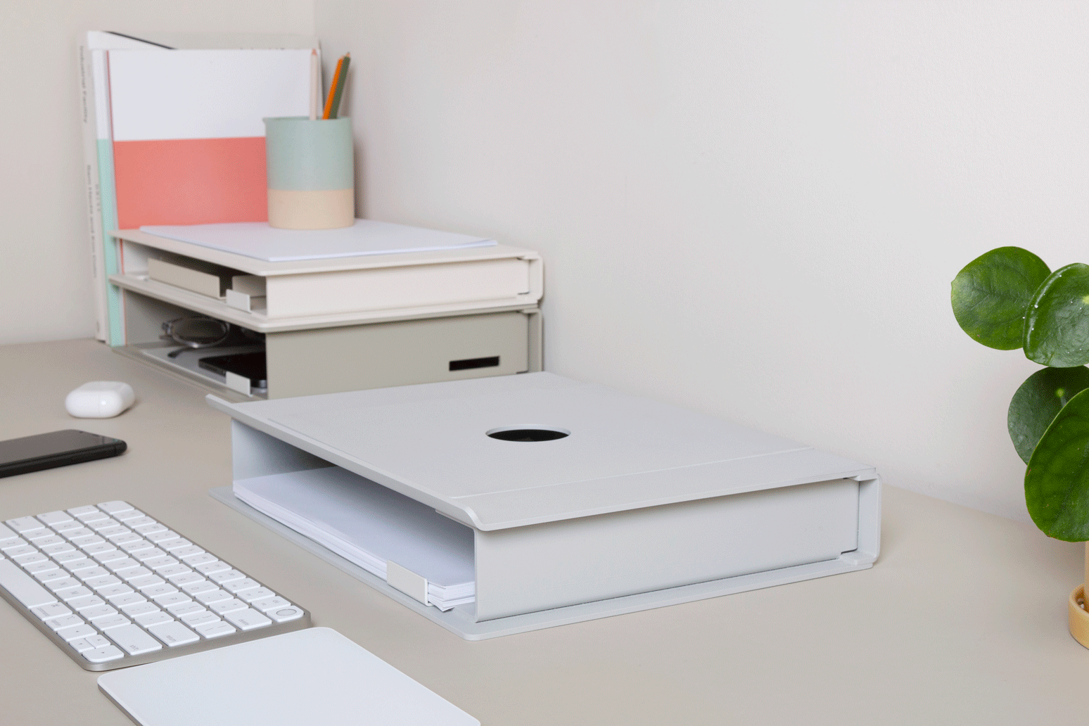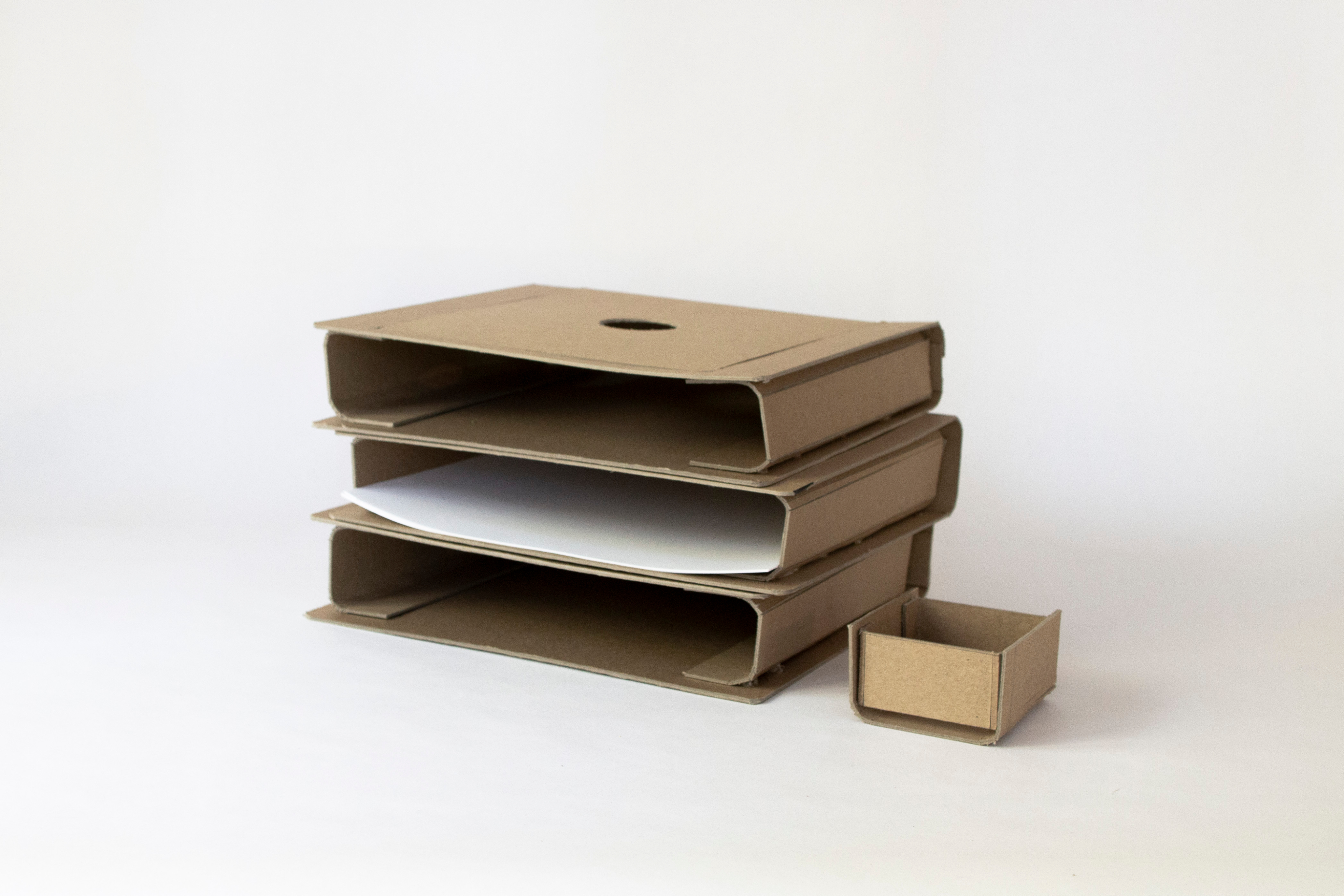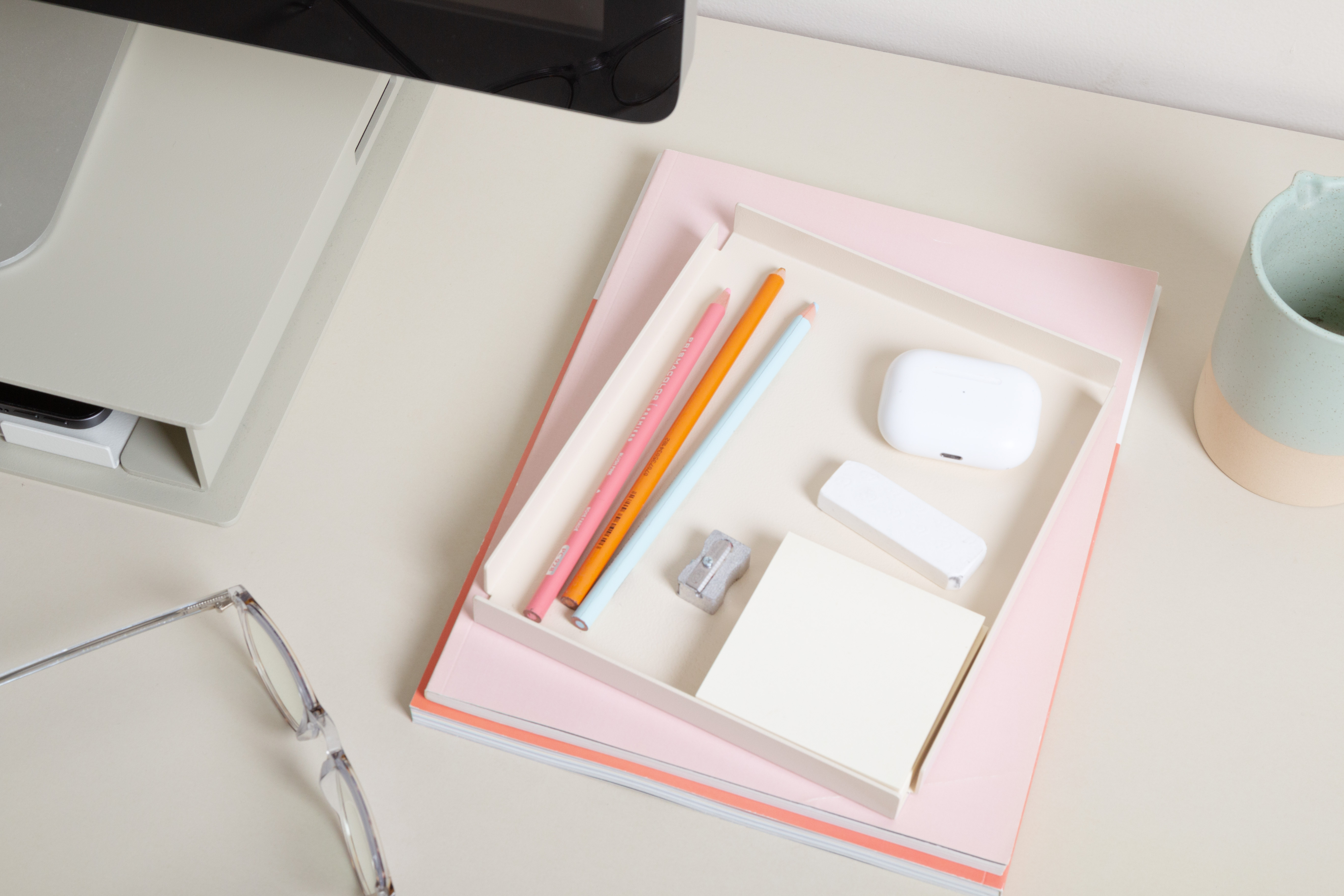 A removable tray for extraneous desk items and accessories nests securely in all containers.
