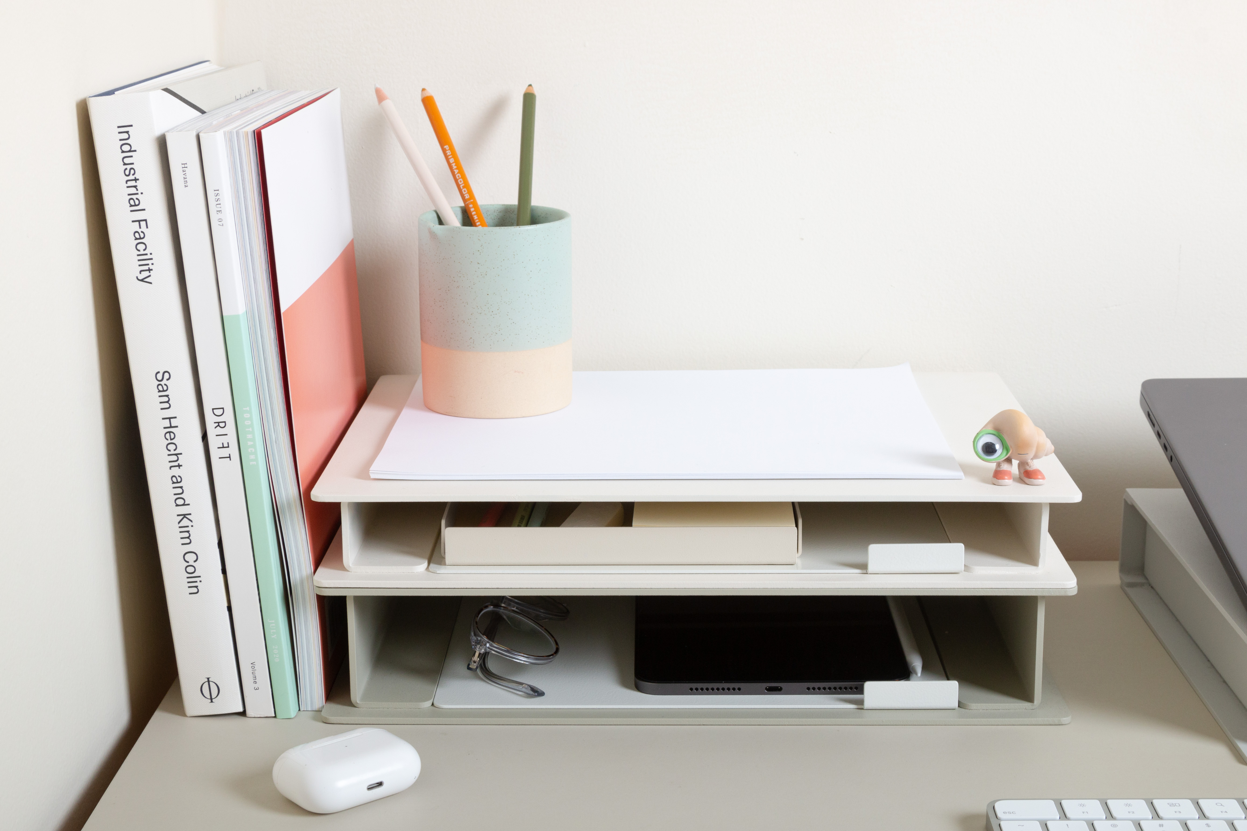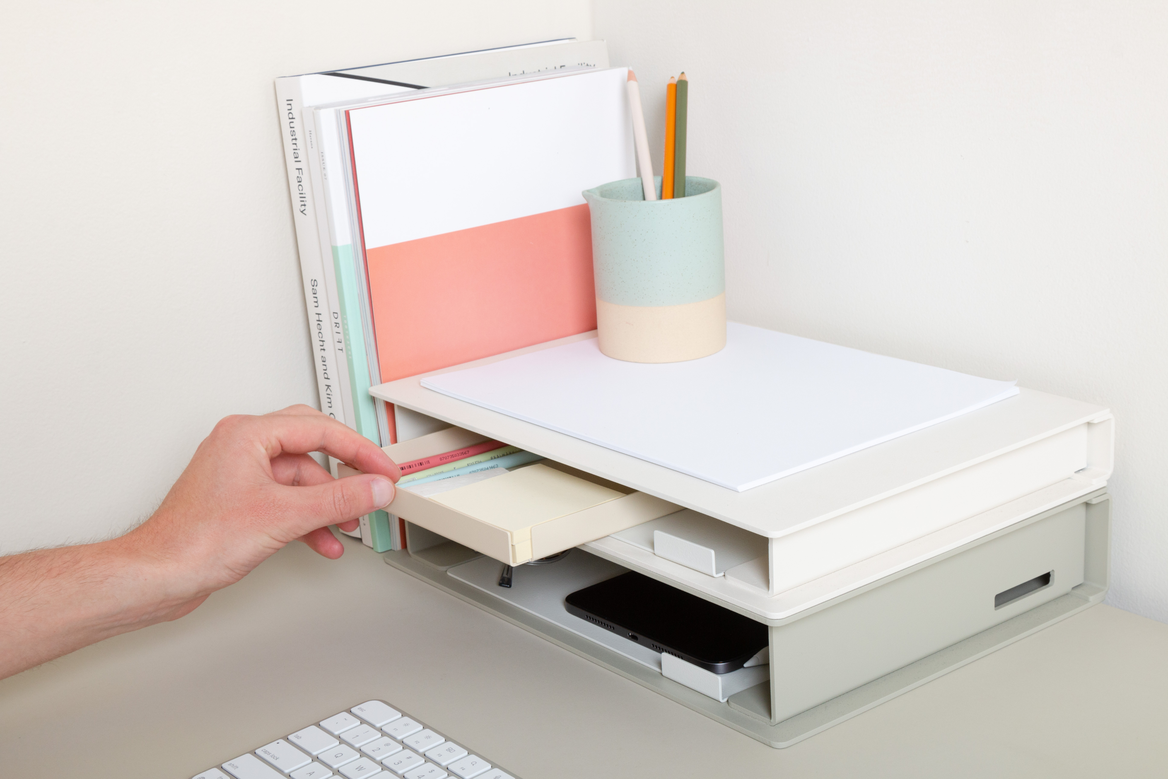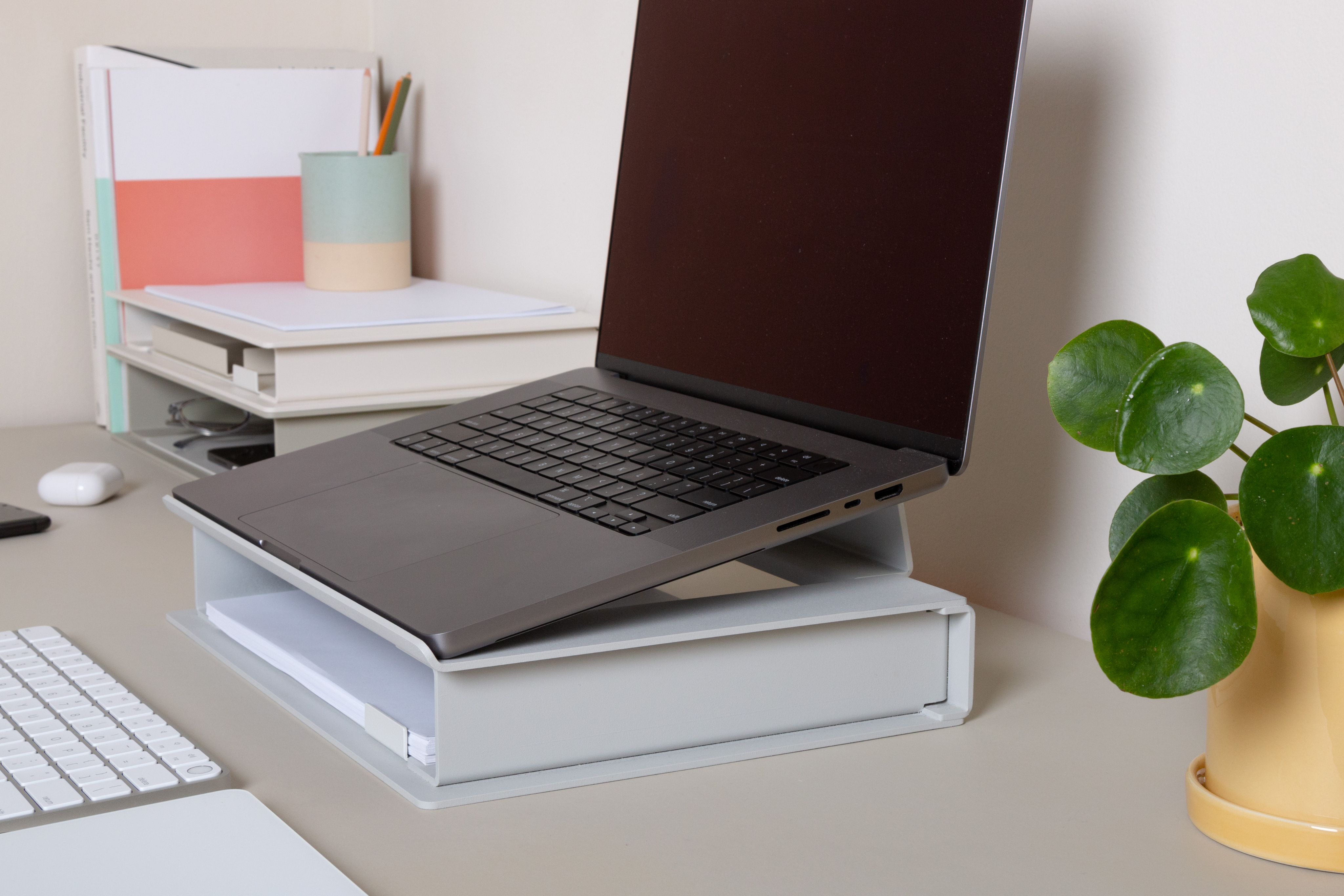 Inspired by the common hack of stacking analog books to raise a laptop or monitor at home, Volumes is an extension of that support – with added functionality and reduction of the noise that a work environment at home brings.